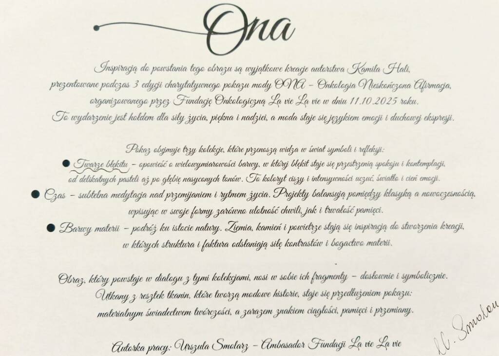 Inspiracją do powstania obrazów są wyjątkowe kreacje autorstwa Kamila Hali, prezentowane podczas 3 charytatywnego pokazu mody ONA – Onkologia. Nieskończona afirmacja, organizowanego przez Fundację Onkologiczną La vie La vie.