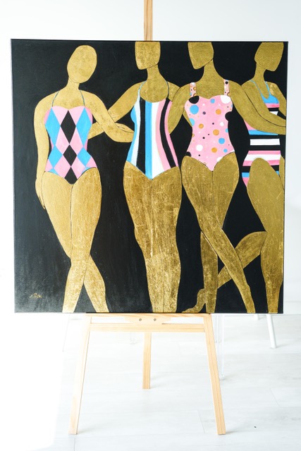 postaciach. Czerń wprowadza element tajemnicy i skupienia, a zarazem wydobywa blask złotych sylwetek. Subtelnie akcenty różu i błękitu wnoszą lekkość i wrażenie intymności, nadając dziełu elegancki, emocjonalny charakter. To obraz o jedności i o sile, która rodzi się, gdy kobiety są razem.